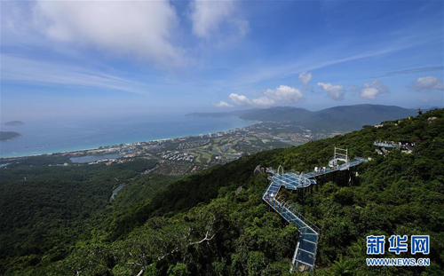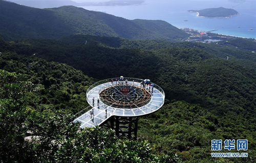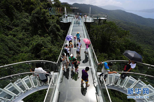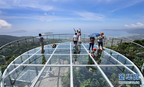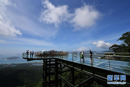 8月31日,游客在玻璃观景平台上参观游览。近日,位于海南省三亚市亚龙湾热带天堂森林公园的大佛石全海景玻璃栈道开始正式营业。凌空而建的玻璃栈道全长400米,游客可将亚龙湾的美景尽收眼底。(新华社 记者郭程摄)