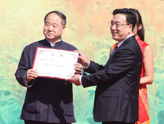 2013年山东高密第四届红高粱文化节上,莫言获颁高密人民勋章