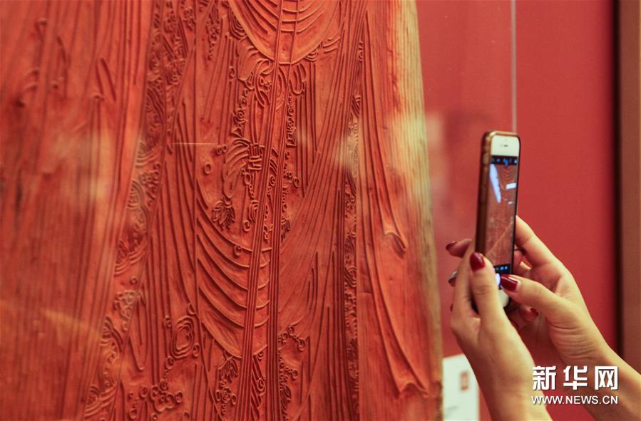 9月5日,观众在展览上拍摄一块展出的雕版。当日,由中国非物质文化遗产保护协会、中国古籍保护协会、杭州市文化广电新闻出版局主办,杭州十竹斋艺术馆承办的“中国印刷术的活化石:十竹斋木版水印艺术作品展”在中国美术馆开幕。《十竹斋二十四节气水印版画》同时被中国美术馆和中国国家图书馆收藏。展览通过杭州十竹斋艺术馆的经典作品展现木版水印技艺画、刻、印过程中的精妙与典雅,展现中国非物质文化传统技艺的博大精深。作为2017年度国家艺术基金传播交流推广资助项目,“十竹斋木版水印艺术作品展”由国家级非物质文化遗产代表性传承人、杭州十竹斋艺术馆馆长魏立中历经30年倾力打造。 2014年,十竹斋“木版水印技艺”入选第四批国家级非物质文化遗产代表性项目名录。 2017年12月,魏立中入选第五批国家级非物质文化遗产代表性项目木版水印技艺代表性传承人。