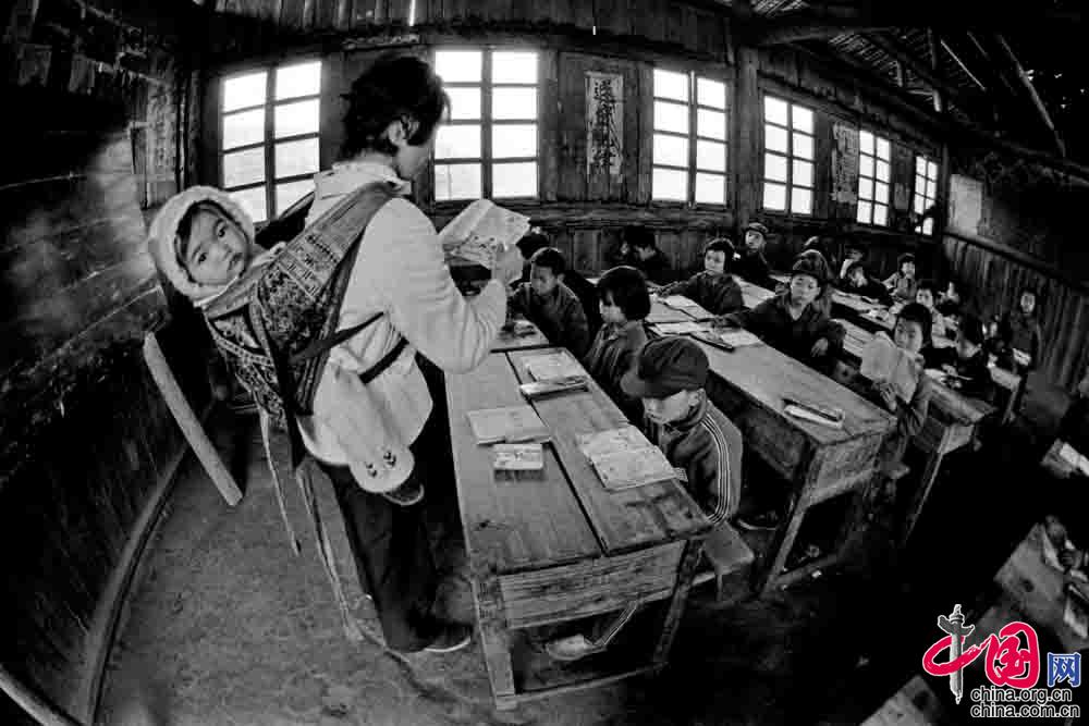 1987年4月,广西壮族自治区融水县安太乡寨怀村小学,戴红英老师背着不满五个月的小女儿上课。