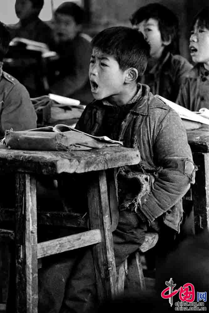 1991年4月,河南省新县八里畈乡王里河小学,胡善辉(大鼻涕 8岁)在大声朗读课文。