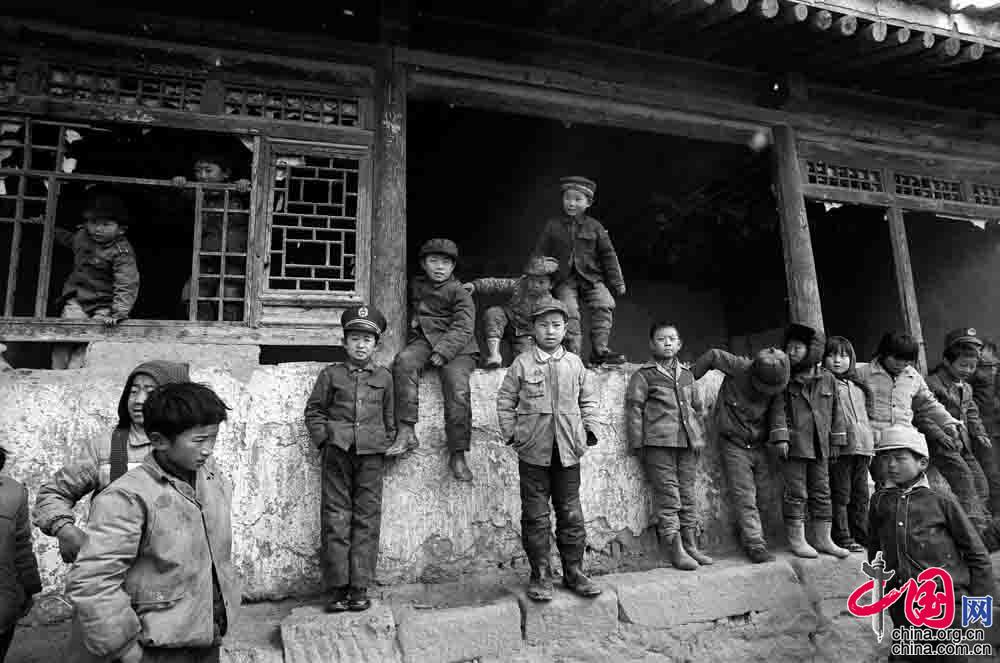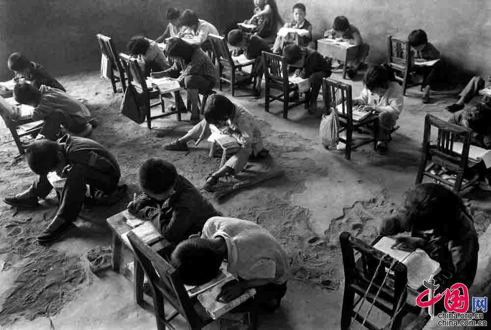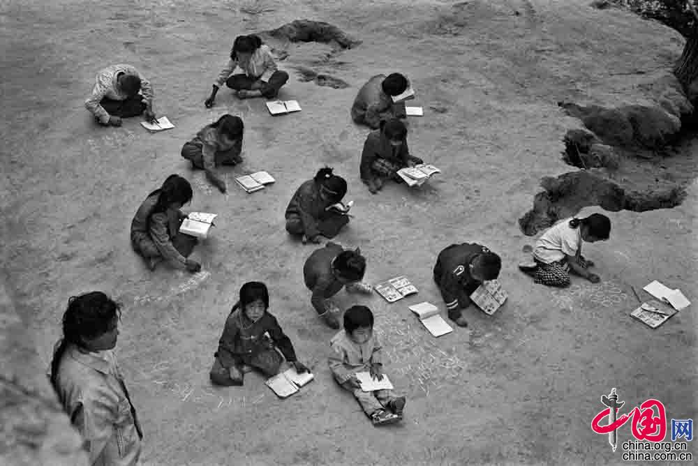 1991年9月,陕西省佳县贺家岩村小学,遇到阴天,教室里便很昏暗,学生们就在室外上课。