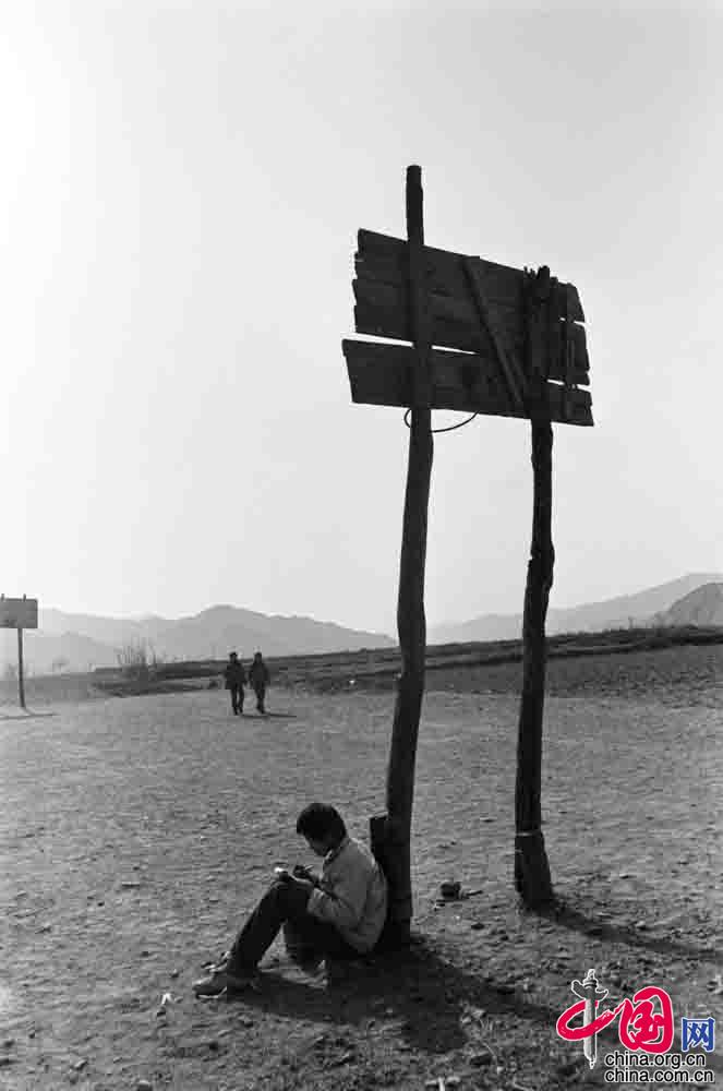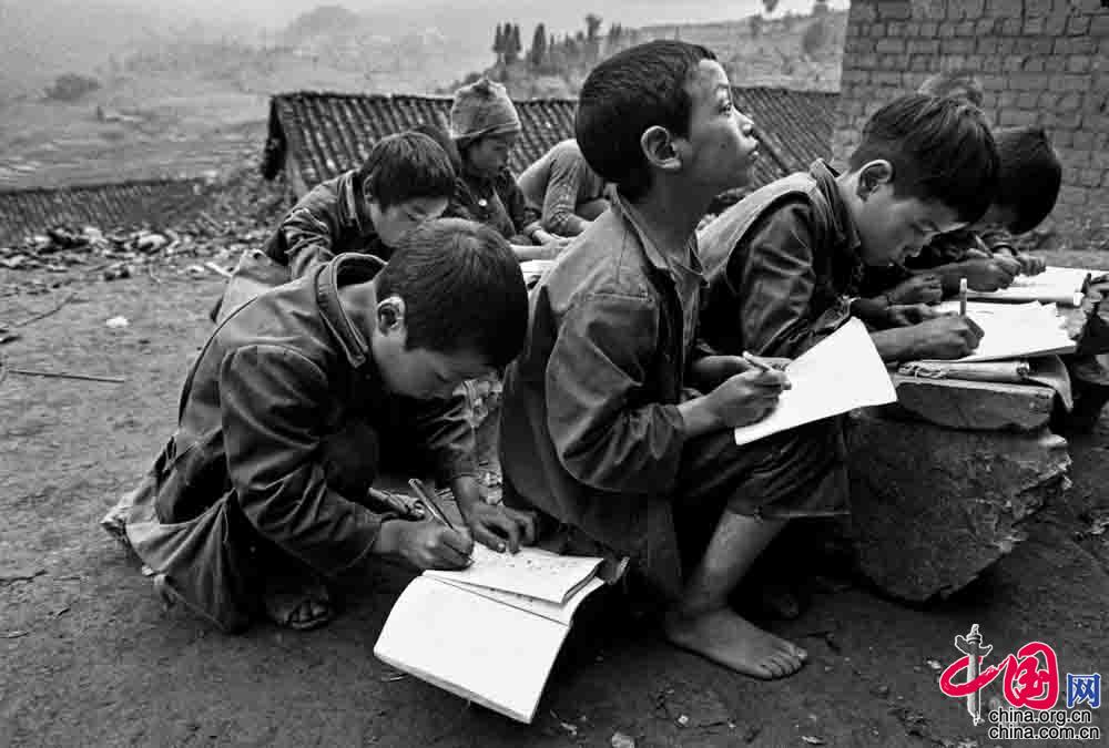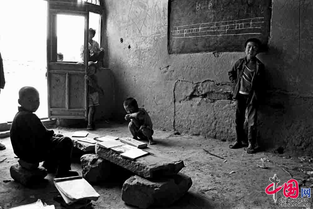 1991年9月, 陕西省佳县王家岩村小学, 这里没有桌凳 ,只有石头和书。