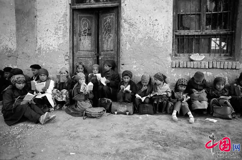 1995年4月 ,新疆维吾尔自治区疏勒县 ,孩子们很早到校早自习。