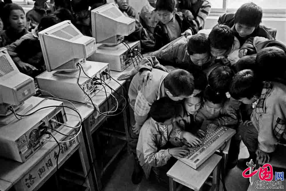 2001年10月 ,河南省宜阳县, 中国交通报送来了旧电脑,孩子们第一次触摸键盘非常开心。
