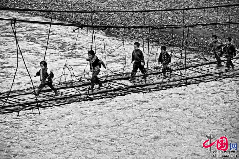 2006年9月, 四川省凉山州昭觉县库依乡, 孩子们小心翼翼地走过极其简陋的悬索桥去上学。