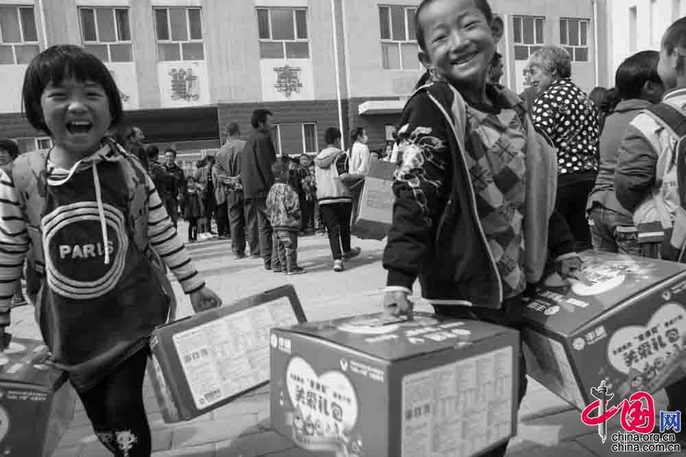 2017年5月,河北省涞源县东团堡中心学校,六一节来临之际,孩子们收到了社会各界送来的礼物。