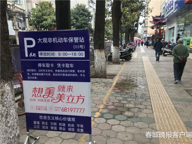 在新闻路篆新农贸市场门口人行道上的电动车停车点,记者看到,一块“P”字标识牌上写有非机动车保管站,“停放时间8:00——18:00”,标识牌中,还有一个商家广告,广告上方的一排小字写着:“按时取车,过时车主自负,贵重物品自行保管若有遗失,本保管站概不负责,因自然灾害造成的损失,车主自行负责。”