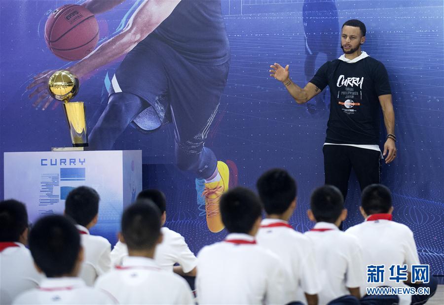 9月10日,库里与小球员分享心得。 当日,NBA金州勇士队球员库里现身武汉室内运动场,与华中科技大学附属中学的小球员互动交流。新华社记者肖艺九摄