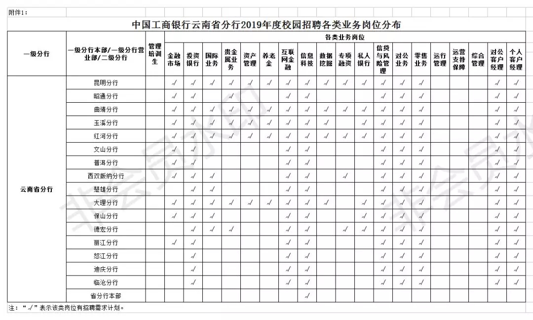 中国工商银行云南省分行2019年度校园招聘各类业务岗位分布