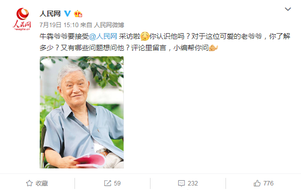 在启程去上海采访牛犇老师的前一刻,我们通过人民网官微发布了“采访牛犇爷爷”的预告,征集网友们想问的问题。