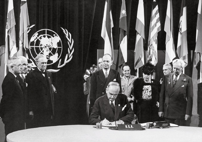 1944年夏,在罗斯福的邀请下,美苏英和中美英三国会议先后于华盛顿附近的敦巴顿橡树园举行。会议建议未来的国际组织名称为“联合国”,规定了联合国的宗旨和原则,以及联合国大会、安全理事会等主要机构的组织和职权。1945年6月26日,《联合国宪章》签字仪式在旧金山举行,美国作为东道国,最后一个签字。然而,手执签字笔的并不是罗斯福,而是他的继任者杜鲁门——两个多月前,罗斯福因突发脑溢血离世。