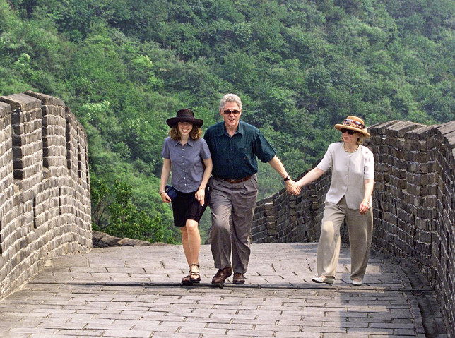 1998年6月28日,美国时任总统克林顿与夫人希拉里、女儿切尔西在北京游览长城。