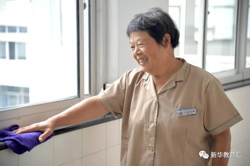 今年65岁的刘彩英阿姨已经在清洁岗位上工作了11个年头。上班时,她拿着大排拖把拖走廊,教室一下课或者活动一结束后,立刻检查,然后扫地、拖地,工作按部就班,该打扫的区域认真打扫,看到其他工友需要帮忙,经常搭把手。她笑着说,自己工作挣钱,花自己的钱踏实。如果拿别人的钱,肯定良心不安。是到了享福的年龄,但自己挣钱自己花,活得舒心,每年还能给孙子压岁钱呢!吃这碗饭,就要弄得好,对得起别人给的工资......