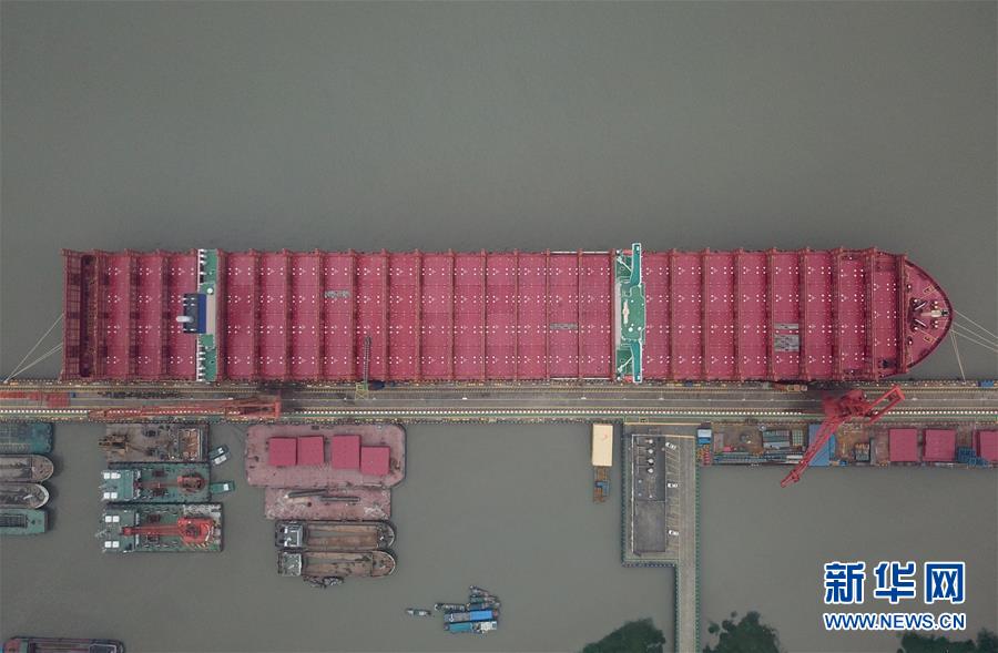 “中远海运室女座”号超大型集装箱船停靠在上海外高桥造船有限公司码头(5月30日无人机拍摄)。 新华社记者丁汀摄