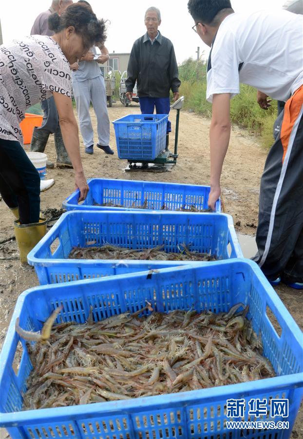 9月15日,河北省唐山市曹妃甸区第一农场职工为从水塘中捕捞的对虾称重。新华社记者马宁/摄