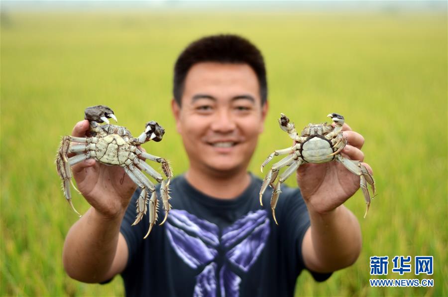 9月15日,河北省唐山市曹妃甸区第一农场职工展示从水稻田中捕捞的稻田蟹。 新华社记者马宁/摄