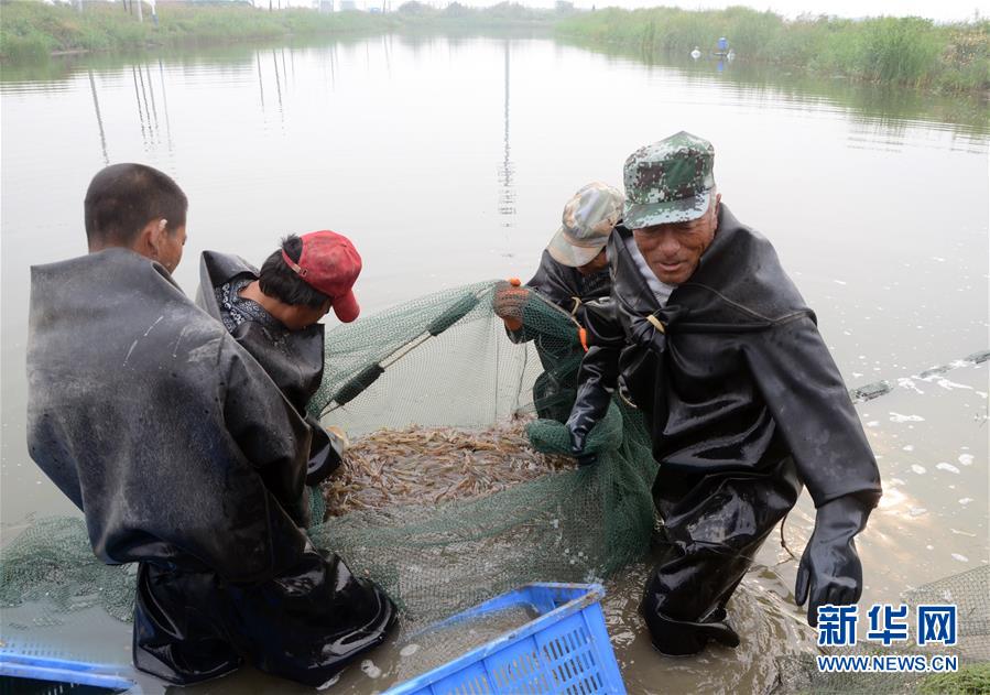 9月15日,河北省唐山市曹妃甸区第一农场职工从水塘中捕捞养殖的对虾。 新华社记者马宁/摄