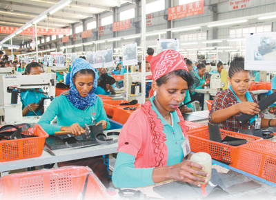 2017年6月,在埃塞俄比亚首都亚的斯亚贝巴的东方工业园里,华坚鞋业公司员工正在生产线上工作。记者暨佩娟/摄
