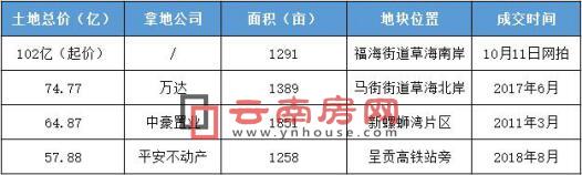 迄今为止,在昆明已经完成的土地交易中,总价地王当属融创昆明万达文化旅游城项目用地。去年6月,万达以74.77亿元斩获草海沿岸的1389亩地,晋升为昆明的总价地王。在此之前,昆明的总价地王纪录由中豪置业在2011年创造,当时,如日中天的中豪置业以64.87亿的价格,拿下新螺蛳湾片区1851亩土地,打破了一年前由实力地产在实力壹方城项目用地上创造的总价地王纪录。