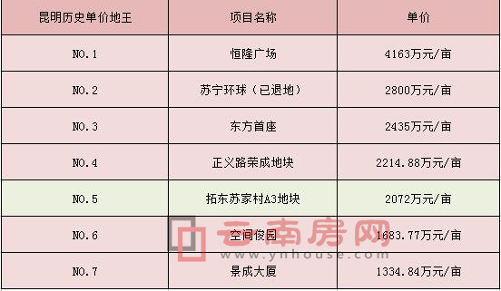 在去年到今年成交的地块中,土地单价最高的要数去年4月昆明盘江置业斩获的苏家村城改地块,其土地单价达2072万元/亩。不过,这一数值在历史成交记录中,也只能排到第五名。