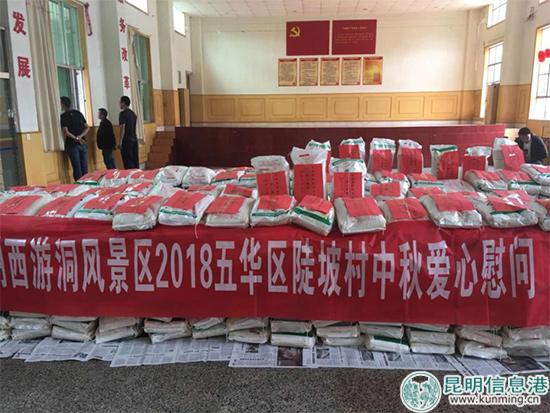 6686体育讯 记者昝娟娟 9月20日,在中秋节即将到来之际,昆明市西游洞公园管理有限公司组织全体员工,到五华区西翥街道办事处陡坡村等地开展“2018年中秋爱心慰问活动”,为当地村民送去大米、食用油、月饼等中秋福利,让村们欢度中秋佳节。
