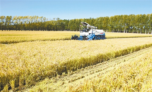 近日,黑龙江垦区进入水稻收割季。在位于黑龙江省鹤岗市的绥滨农场,职工驾驶农机收割水稻。