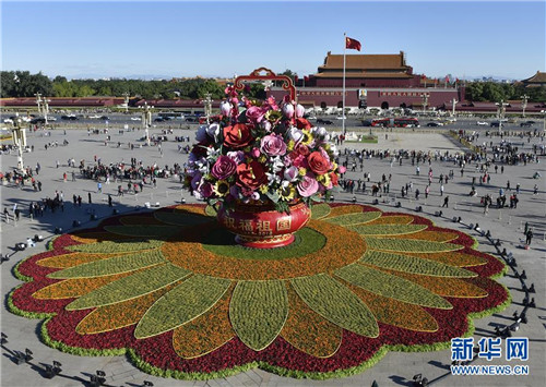9月23日在北京天安门广场拍摄的“祝福祖国” 巨型花篮。 新华社记者 李贺/摄