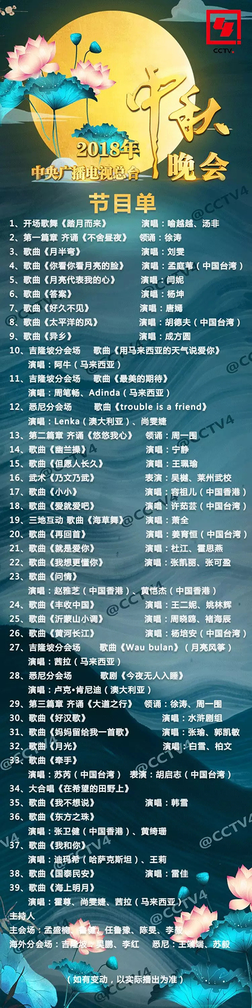 中秋晚会将于今晚20点开始,时长共150分钟,包含舞蹈、歌曲、武术、齐诵类节目39个。届时,将由9位主持人带您一起过节,通过三个会场的交替互动展现全球华人过中秋、天涯共此时的美好时刻。