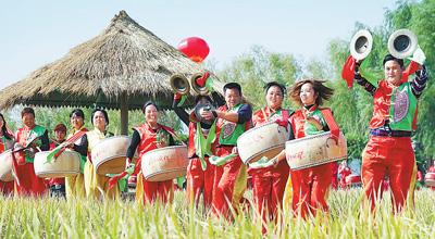 23日,河南省原阳县太平镇水牛赵村农民在稻田间擂鼓起舞,庆祝自己的节日。新华社 记者李安/摄