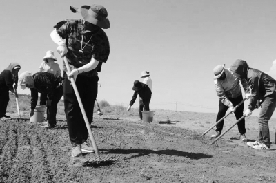 阿拉善地区是典型的干旱半干旱地区,风大沙多,昼夜温差大,植被覆盖率低。老师们将20人的实践团队分为播种组和栽培组,播种组的任务是开垦荒漠土地,播种混有紫花苜蓿、沙打旺、冰草、天人菊、二色补血草等多种沙漠植物的种子;栽培组的任务是栽植生命力极强的沙漠植物景天。