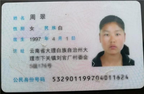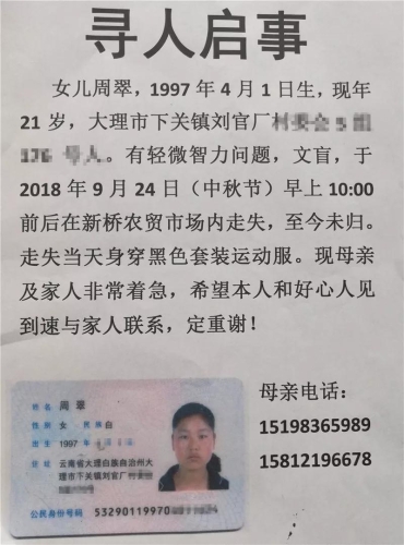 周翠,1997年4月出生,现年21岁,大理市下关镇刘官厂村委会人,于9月24日(中秋节)早上10点左右在新桥农贸市场内走失,至今没有回家。