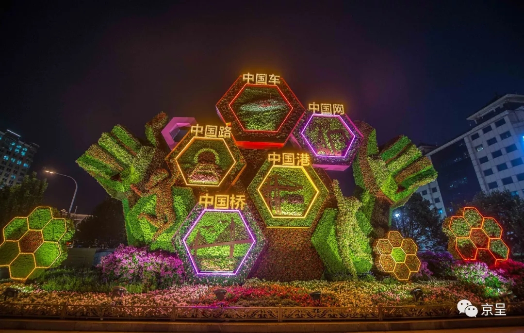 “辉煌中国”主题花坛,通过重大工程的建设成就(中国桥、中国路、中国车、中国港、中国网),讴歌了伟大祖国从站起来、富起来到强起来的伟大飞跃,展现辉煌中国新时代新风貌。