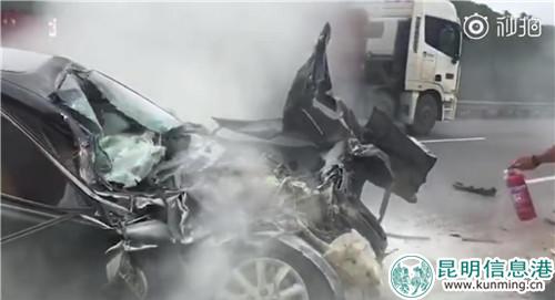 事故发生时,楚雄消防支队11名官兵正好乘车赴昆,参加云南省消防总队的搜救犬考核任务。了解情况后,消防官兵立刻组织开展救援工作,他们使用车内配备的灭火器,对事故轿车油箱和车头部位喷射灭火。