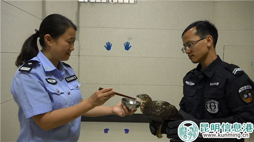 接到报警后,文山州森林公安局民警迅速赶到农贸市场,在报警人余师傅的三轮车上看到了这只有些虚弱的鸟。余师傅告诉民警,由于担心鸟挨饿,他还给它捕捉了一只老鼠吃,这只鸟非常凶猛,双脚套有刻着编码的铜环,还拴有牛皮绳索。