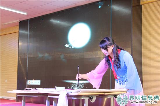 辅导员现场展示书法“月韵”。实习记者庄园 摄