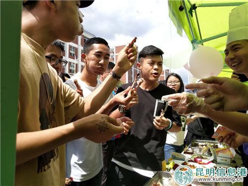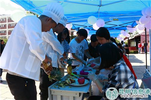 美食节现场,同学们自己动手烹饪起了美食。热腾腾的饺子、酸辣可口的傣味拌芒果、麻辣入味的绝代双椒鱼、脑洞大开的创意水果拼盘……各式色香味俱全的菜肴,吸引了上千民师生驻足品尝。