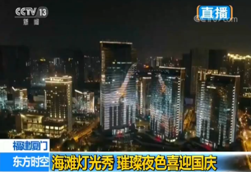 厦门夜景最绚丽的地方,这里的二十几栋大楼,每天晚上都会变身灯光秀的舞台。不过国庆期间和平日还是有所不同,为庆祝国庆进行了特别的设计和修改。