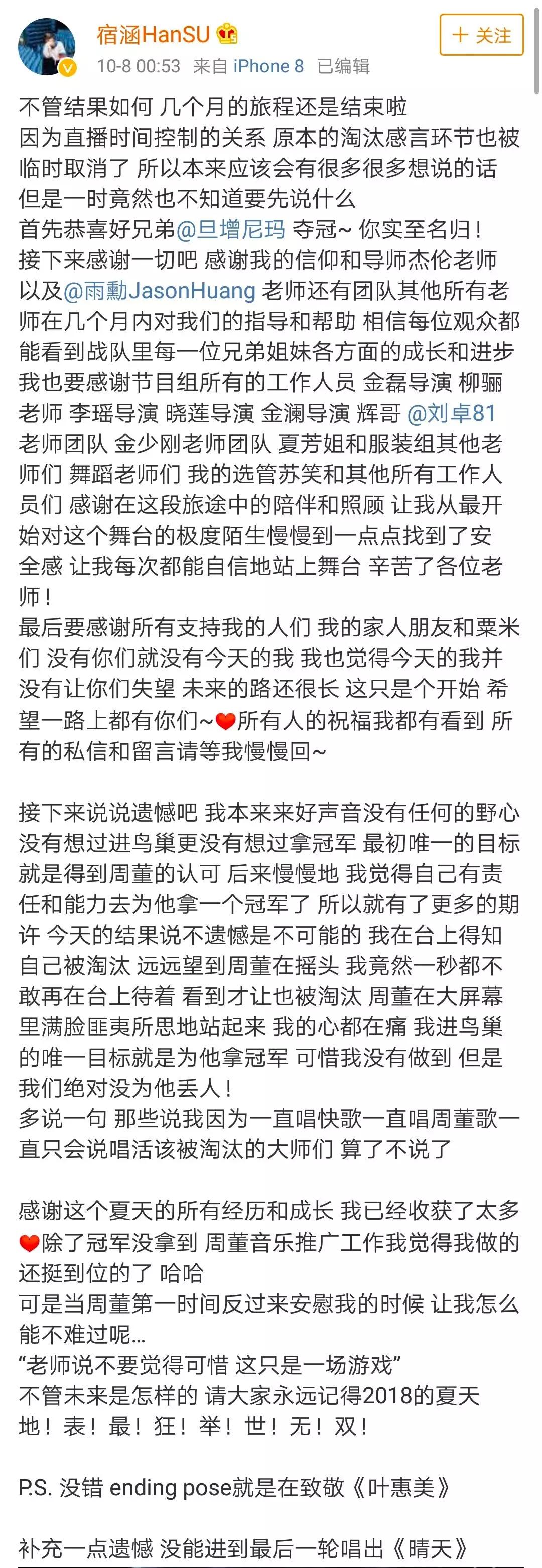 赛后,宿涵通过微博表示,“感谢这个夏天的所有经历和成长,我已经收获了太多。”↓↓↓