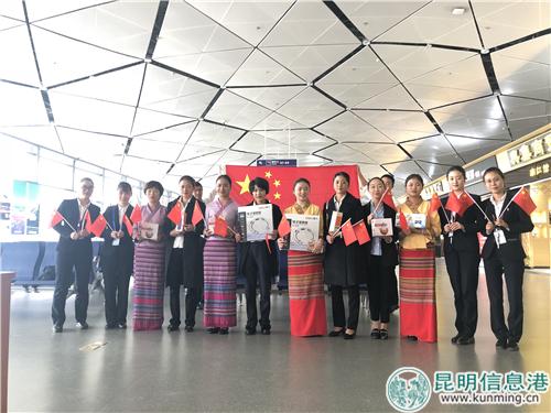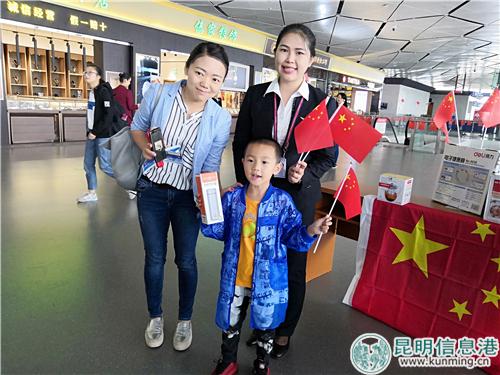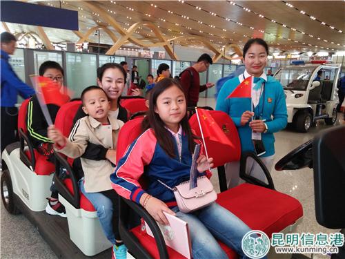 黄金周期间,昆明机场在航站楼内开展“帮一把、扶一把”和“亲车熟路”一条龙爱心服务等,工作人员在航站楼电瓶车、手推车服务区域,热情地为节日当天出行的小旅客们赠送精致的小国旗和小风铃;旅客在问询台参与活动赢得爱心乘车凭证,就能到隔离区内电瓶车乘车点免费乘坐电瓶车。