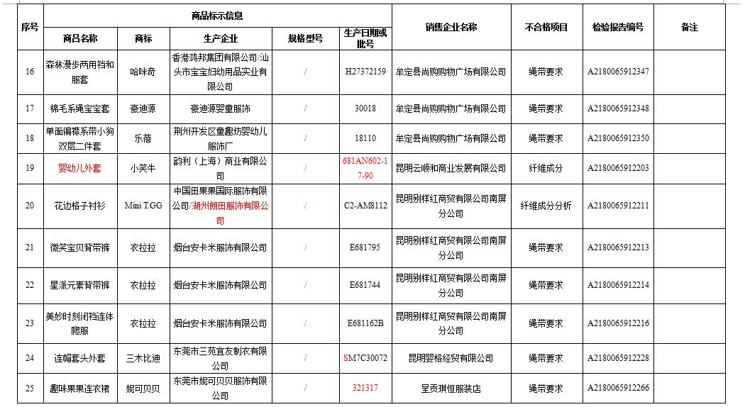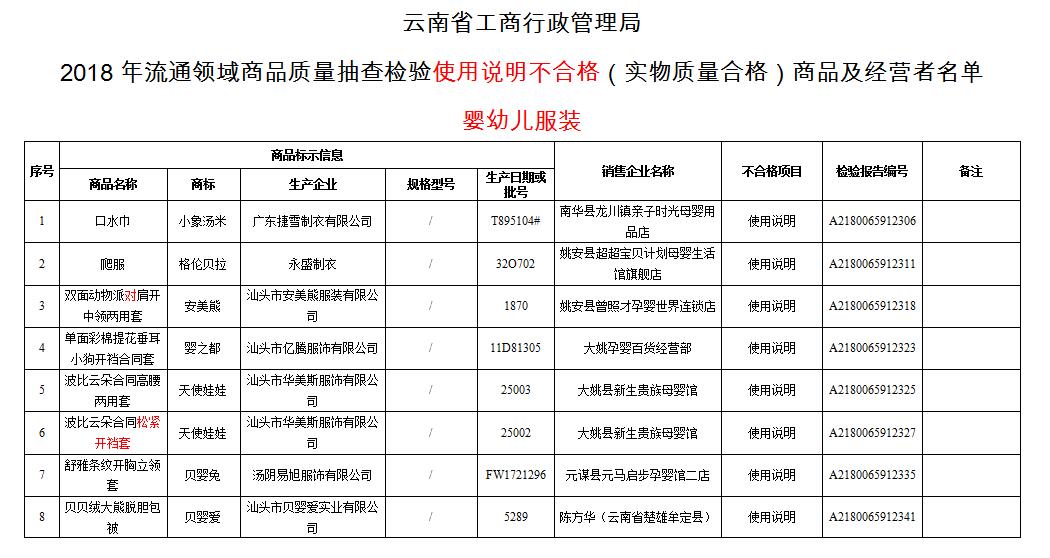 近日,春城晚报、春城晚报客户端记者从云南省工商局获悉,根据《消费者权益保护法》、《产品质量法》有关规定,省工商局于2018年组织并委托有资质的承检机构对云南省流通领域销售的婴幼儿服装、电线、建筑用钢筋、低压电器、消防器材等5类商品开展了质量抽查检验,经承检机构检验后认定不合格商品共170款,其中婴幼儿服装涉及70款。