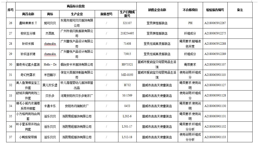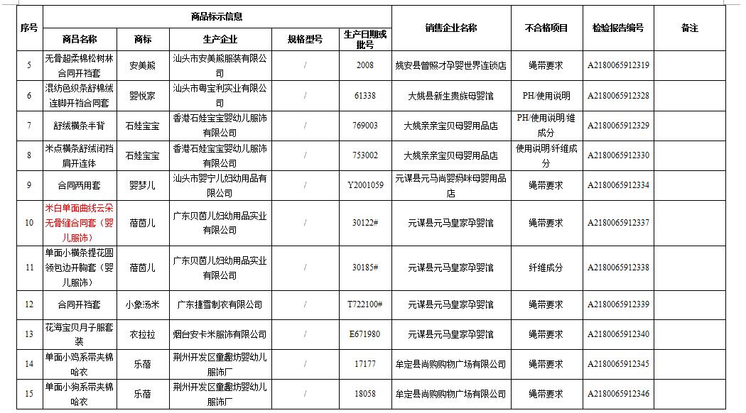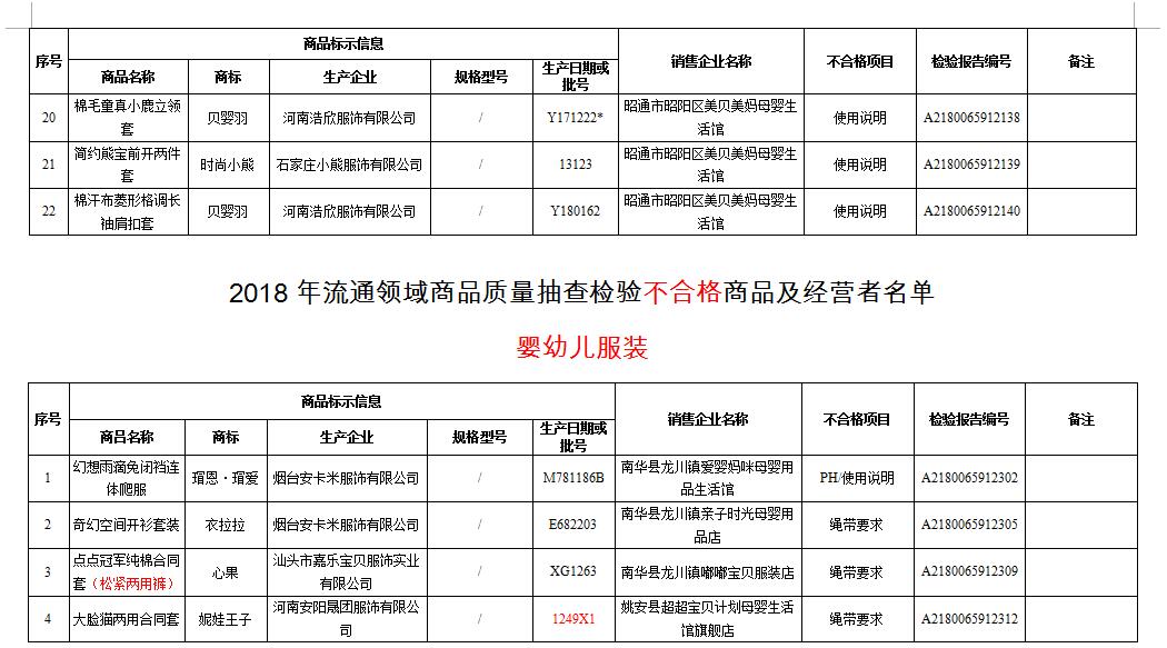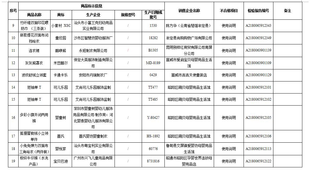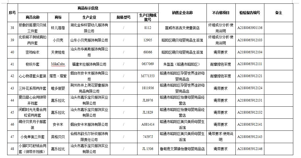 记者了解到,此次“曝光”的婴幼儿服装品牌有天使娃娃、婴童树等品牌,生产企业大多在广州、汕头、广东、烟台等地,销售企业则分布在南华县、姚安县、大姚、元谋、牟定等州市县的母婴店,也有开在昆明南屏街、呈贡区、宣威市区、昭通昭阳区等闹市区的母婴生活馆。不合格项目既有使用说明不合格,也有ph值、绳带要求、纤维成分分析不合格。