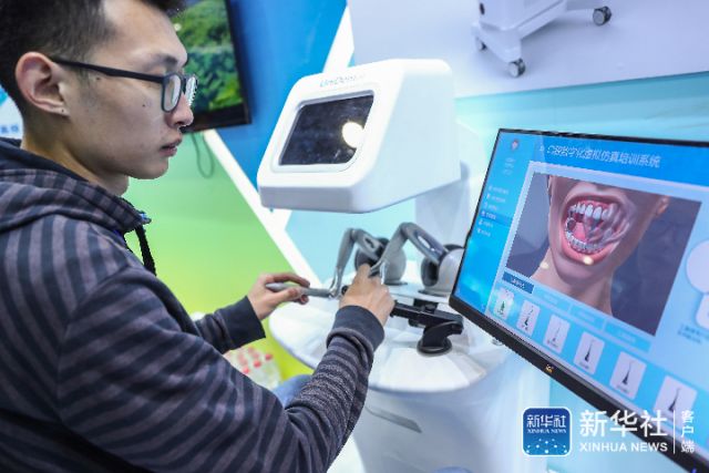10月9日,工作人员在“双创周”北京会场主题展上展示一款口腔手术模拟器。新华社 记者张玉薇/摄