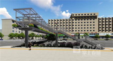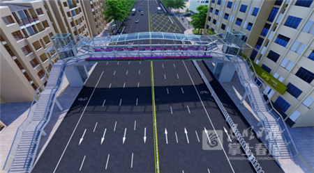 天桥上部采用铝合金桁架结构,下部采用钢筋混凝土结构。上部桁架跨径为单跨27.6m,总长38.6m,桥面全宽4.5m,净宽4.0m,梯道宽2.5m,桥梁总投影面积为396.3㎡,桥梁东西端各设一部垂直电梯。桥下最小净空5.0m。桥梁设计使用年限为 50年。
