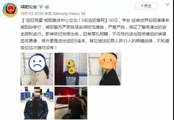 9月30日,咸阳演唱会,5名逃犯和13名其他违法犯罪人员被抓。