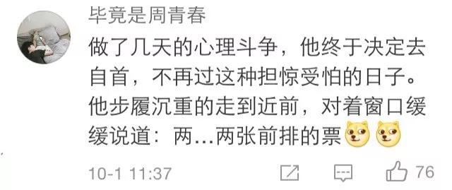 有网友还说起了段子:“做了几天的心理斗争,他终于决定去自首,不再过这种担惊受怕的日子。他步履沉重的走到近前,对着窗口缓缓说道:两…两张前排的票”