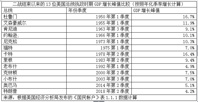 上文仅对21世纪美国4位总统任期内的美国GDP增长峰值,进行了比较。如果对二战结束以来的美国所有总统任期内的GDP增长峰值进行比较,那么特朗普治下的美国GDP增长表现将变得更糟。事实上,特朗普治下的美国GDP增长峰值是二战结束以来的13位美国总统中最低的。