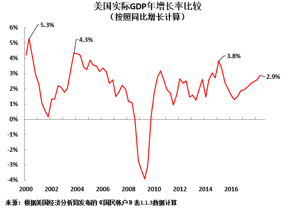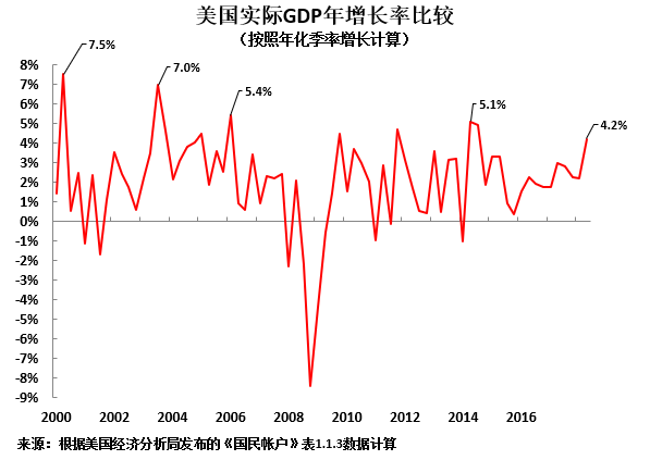为便于大家对此有进一步的认识,图3呈现按照美国GDP统计(年化季率增长)方法计算的21世纪美国GDP增长数据。按照年化季率增长计算,2018年第二季度美国GDP增速是2018年第二季度美国GDP增速与第一季度美国GDP增速作比,然后乘以4。如图3所示: