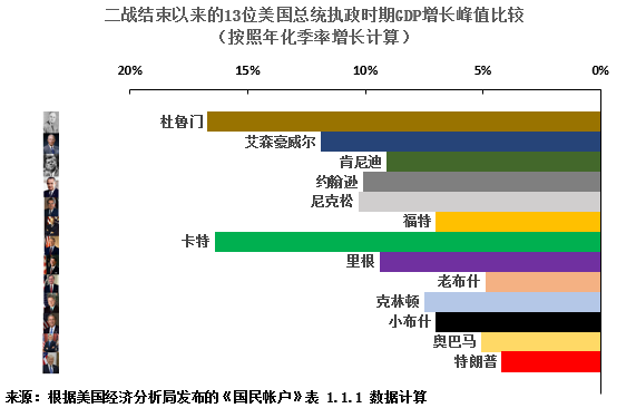 特朗普治下的美国GDP增长峰值是二战结束以来的13位美国总统中最低的