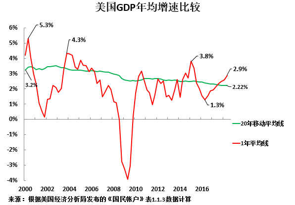 详细分析美国经济周期趋势可以看出,美国长期平均增长率为 2.2%。但当然,美国经济周期是围绕这一范围内上下波动。美国最近的经济周期低谷是2016年第二季度,GDP同比增长1.3%,比其长期增速低0.9%。假设美国经济处于经济周期的顶部,要维持长期平均增速,美国GDP年增长率就必须超过长期平均增速0.9个百分点 ,即要达到3.1%,而这实际上高于2.9%的最新增速。因此,2018年第二季度美国GDP同比增长2.9%并不算高。
